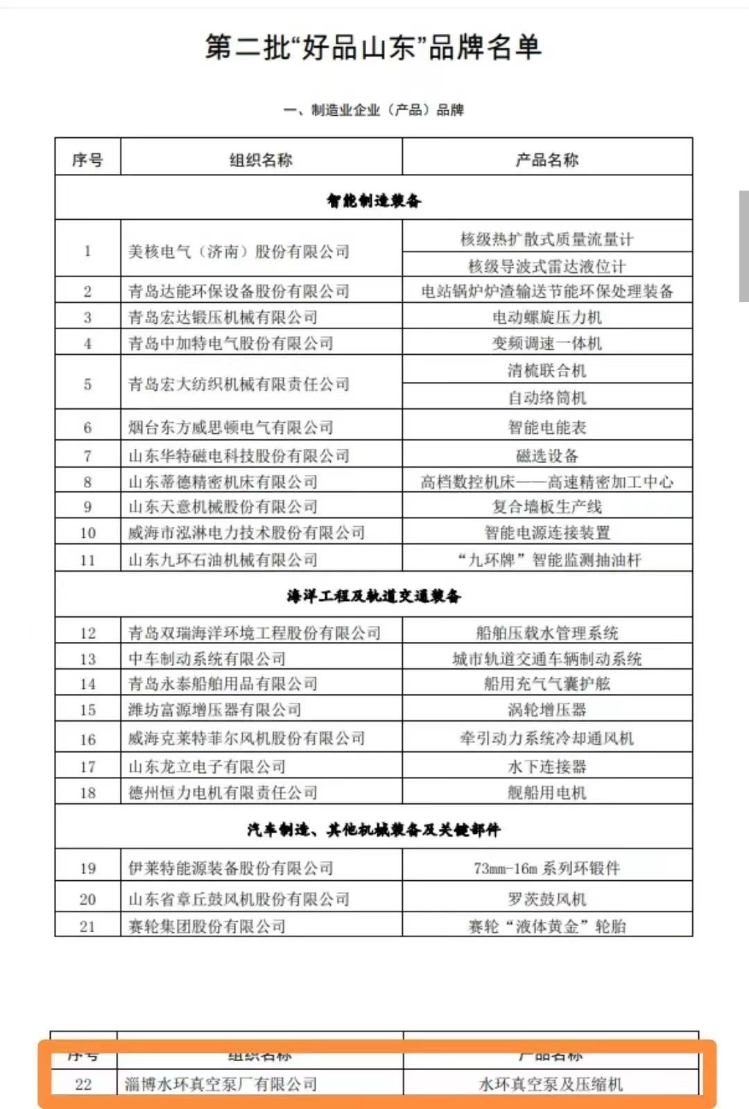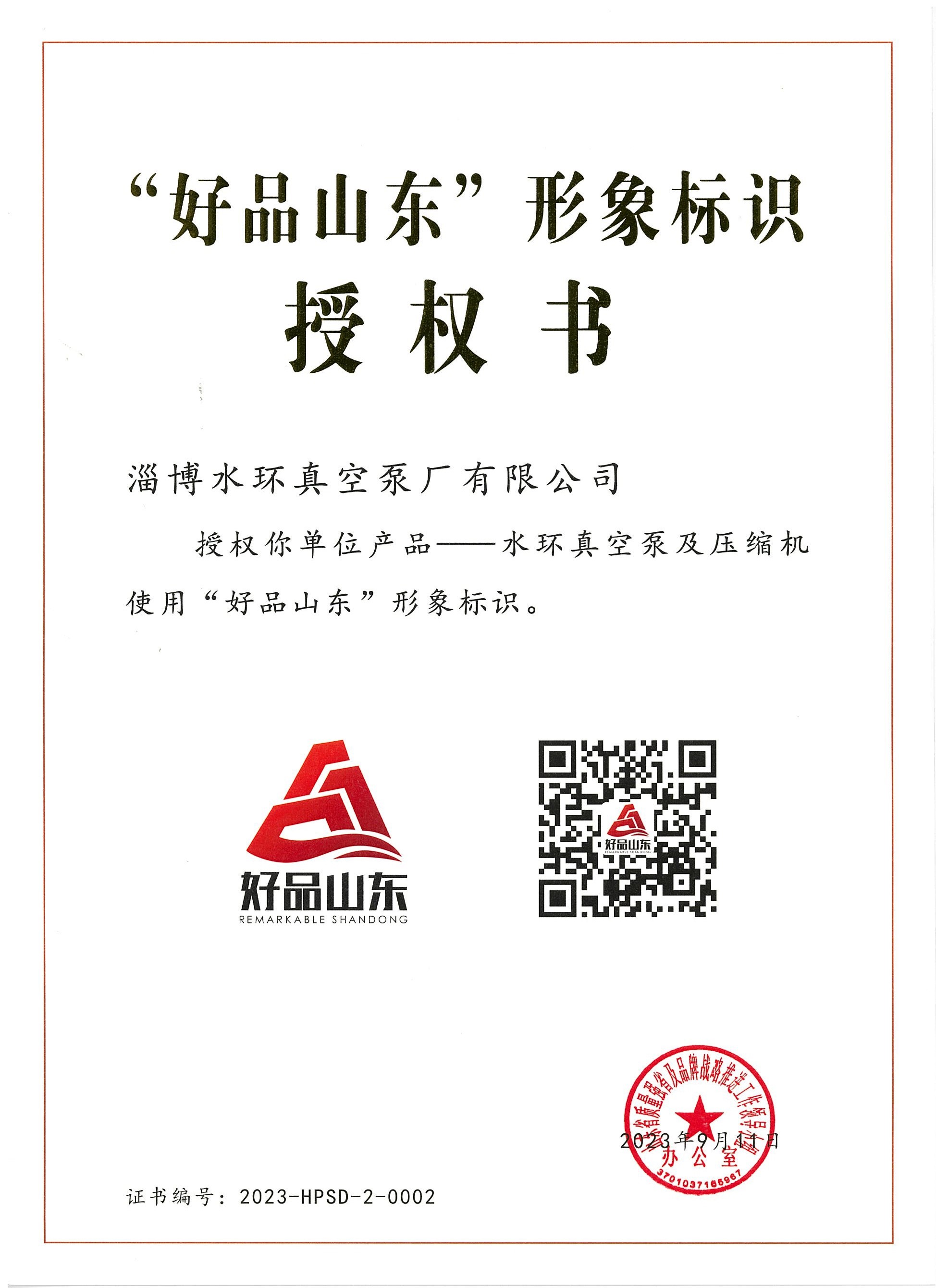 淄博水環(huán)真空泵廠有限公司榮獲山東省“好品山東”形象標(biāo)識(shí)的授權(quán)使用證書(shū)